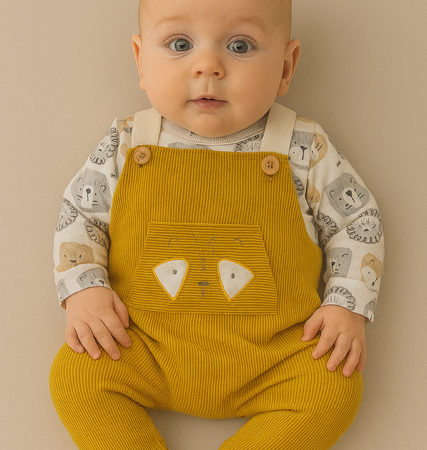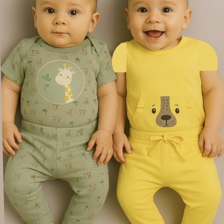 Composto por uma blusa com aplique de cachorrinho e orelhinhas em 3D, além de uma calça super confortável com punhos e listras laterais, o conjunto une praticidade, estilo e liberdade de movimento. O tecido macio e quentinho garante o bem-estar do bebê, enquanto os detalhes em amarelo dão um toque alegre e moderno ao look.