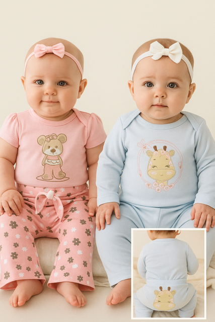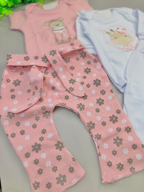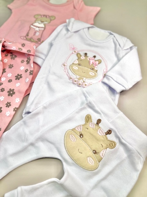 O body rosa possui manga curta com bordado delicado de ursinha, trazendo um toque de ternura. O body branco de manga longa acompanha o clima meia estaçao, com um bordado exclusivo de girafinha, combinando com a calça , que conta com um detalhe bordado no bumbum, encantando em todos os ângulos.