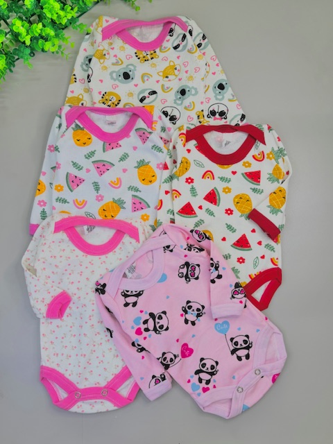 5 Body Bebê Canelado manga longa feminino– kit 5 Unidades | Estampas Variadas |100%algodao