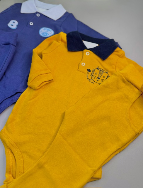 - Funcionalidades: Este conjunto radiante traz um body de manga longa com uma gola polo azul marinho contrastante e um adorável aplique de leão, que adiciona um toque divertido e selvagem. Os botões na gola facilitam o vestir. A calça, no mesmo tom vibrante de amarelo mostarda, possui cós elástico e punhos para um ajuste confortável e seguro, acompanhando o crescimento do seu leãozinho. 👑🐯