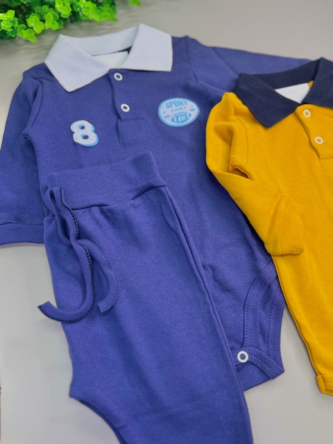 - Funcionalidades: Este conjunto super estiloso é composto por um body de manga longa com gola polo branca e botões, perfeito para um visual mais arrumado sem perder o conforto. Possui um aplique de número "8" e um emblema "SPORT" que dão um toque atlético e moderno. A calça azul marinho tem cós elástico com cordão para ajuste, garantindo que o bebê fique à vontade para se movimentar e brincar. 💪🍼