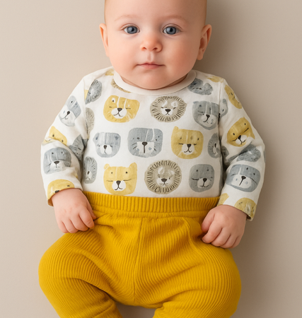 - Dicas de Uso: Perfeito para o dia a dia, para estimular a criatividade nas brincadeiras ou para um passeio divertido. A estampa de leão é cativante e cheia de personalidade! As mangas longas são ideais para proteger o bebê do vento e do frio leve. ☀️🌳