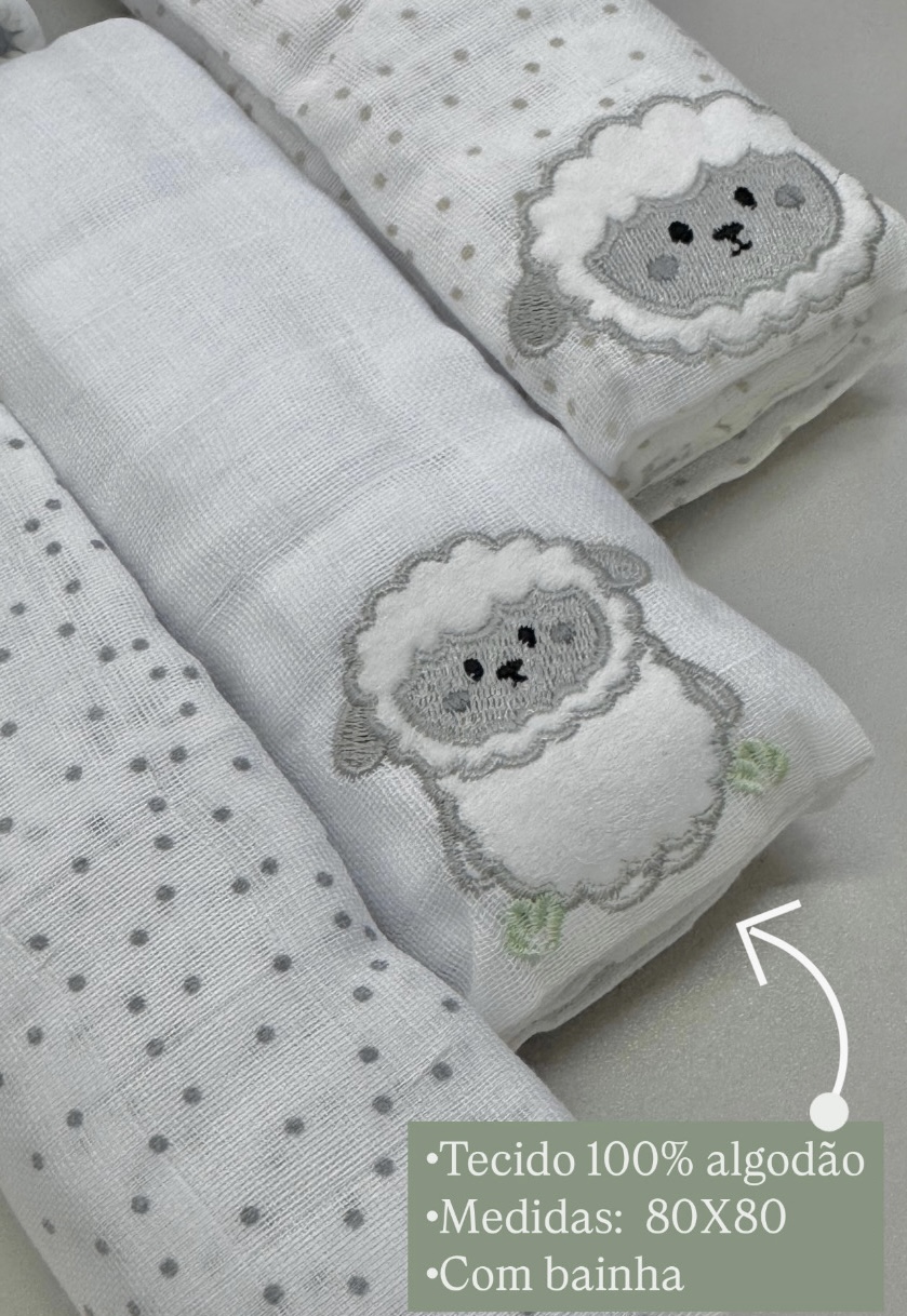3 Fraldas de Pano – Confeccionadas em tecido 100% algodão, leves e respiráveis, ótimas para auxiliar na higiene e nos cuidados diários.