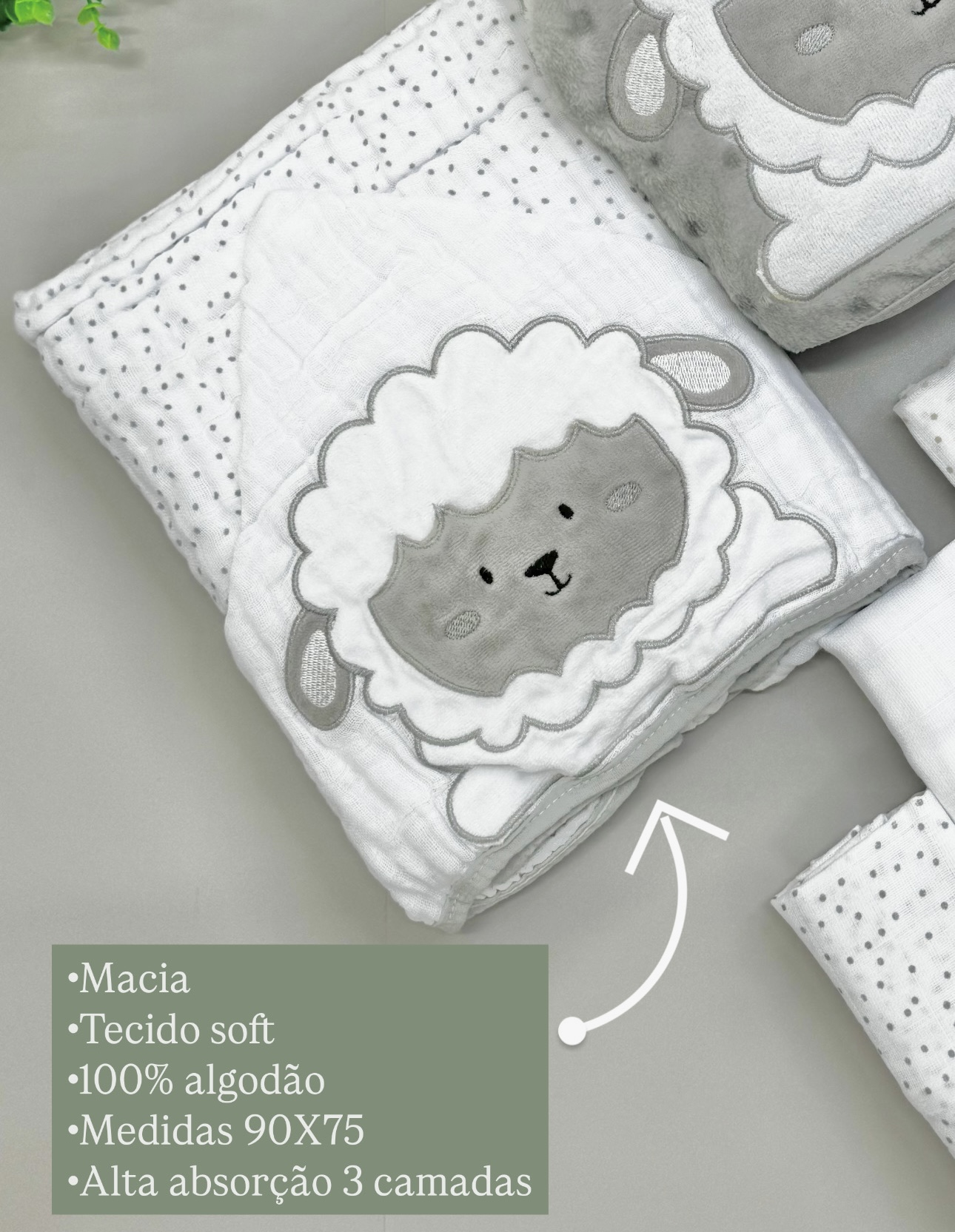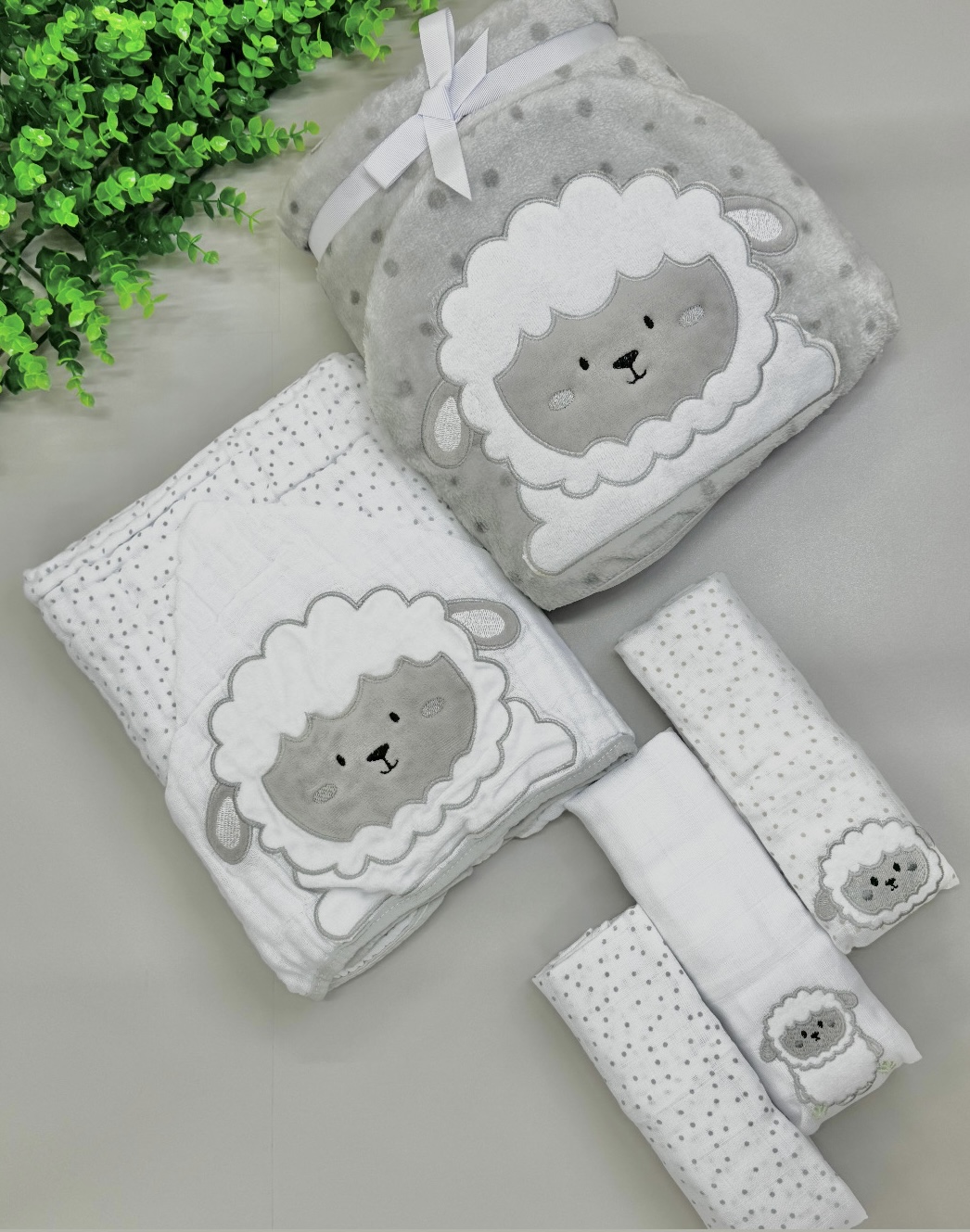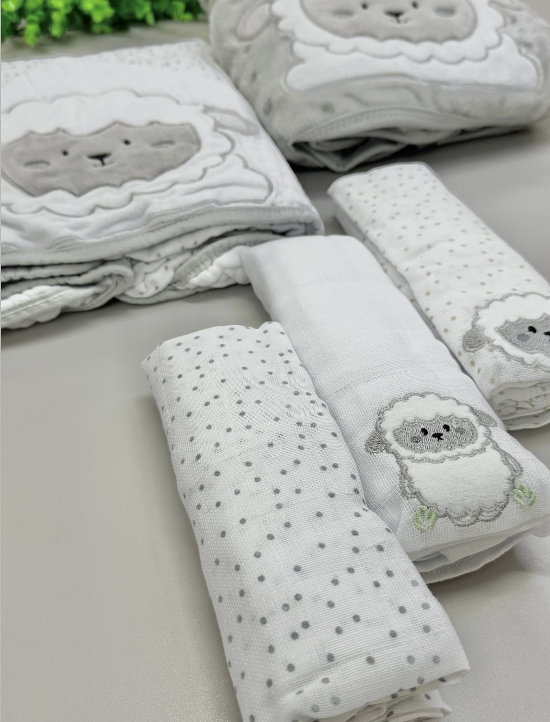 O Kit Enxoval Papi é a escolha perfeita para proporcionar conforto e aconchego ao seu bebê. Com um design delicado e bordados de ovelhinha, este conjunto une maciez e praticidade para o dia a dia.
