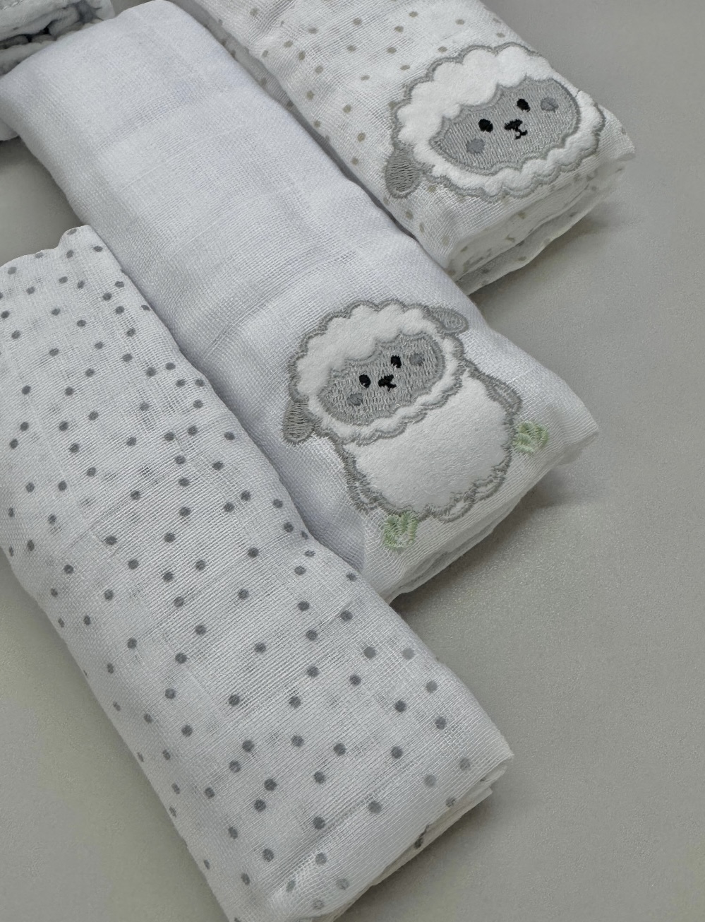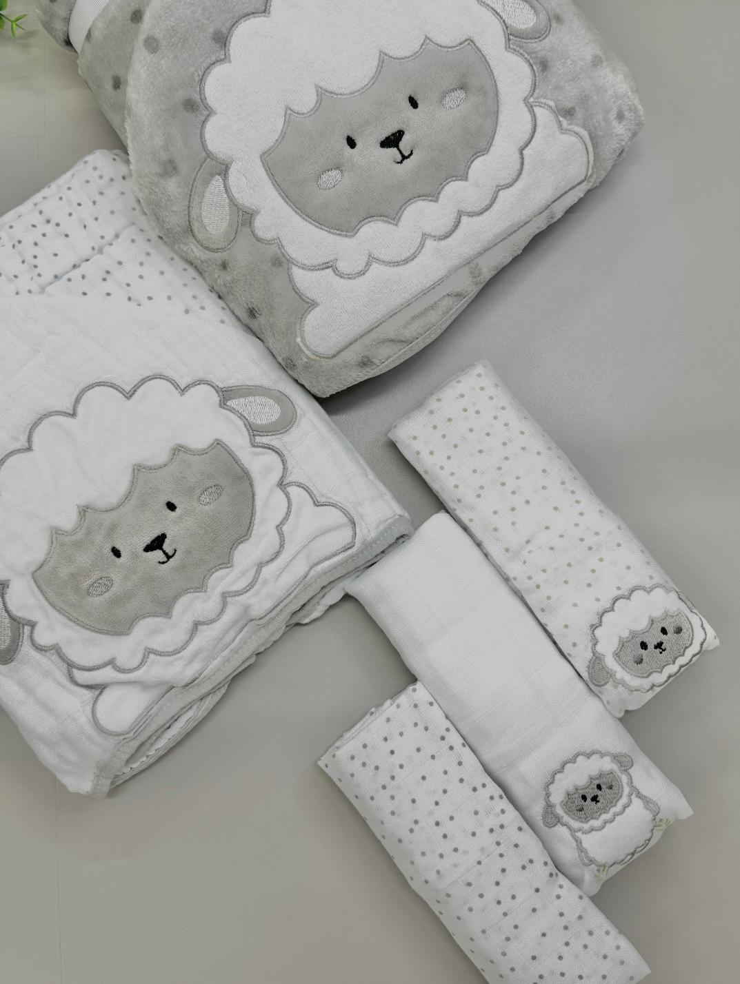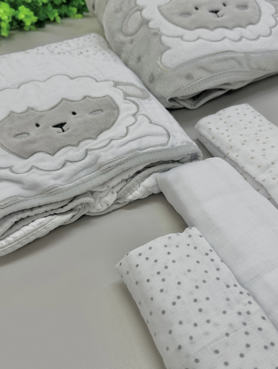 O Kit Enxoval Papi é a escolha perfeita para proporcionar conforto e aconchego ao seu bebê. Com um design delicado e bordados de ovelhinha, este conjunto une maciez e praticidade para o dia a dia.