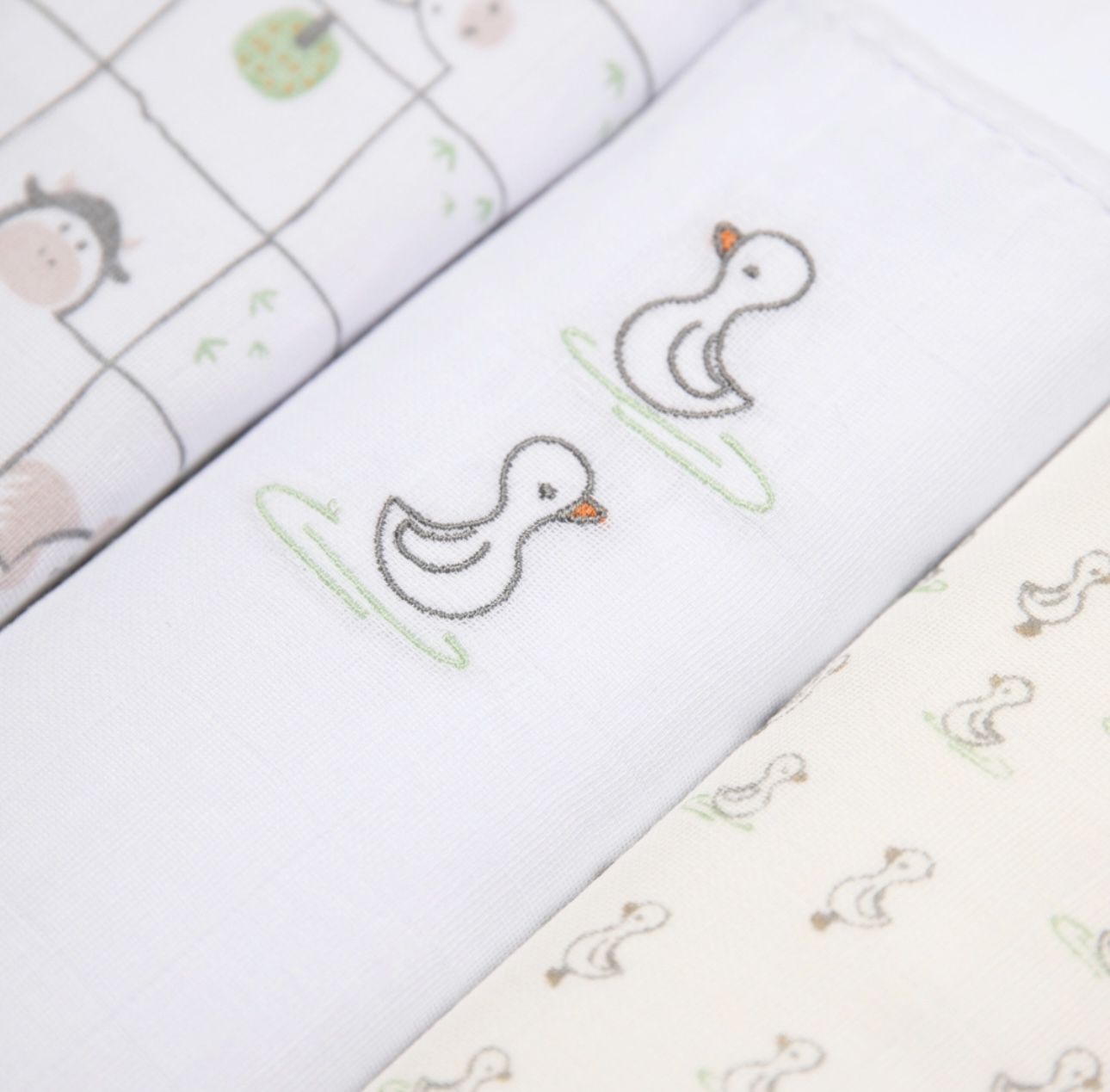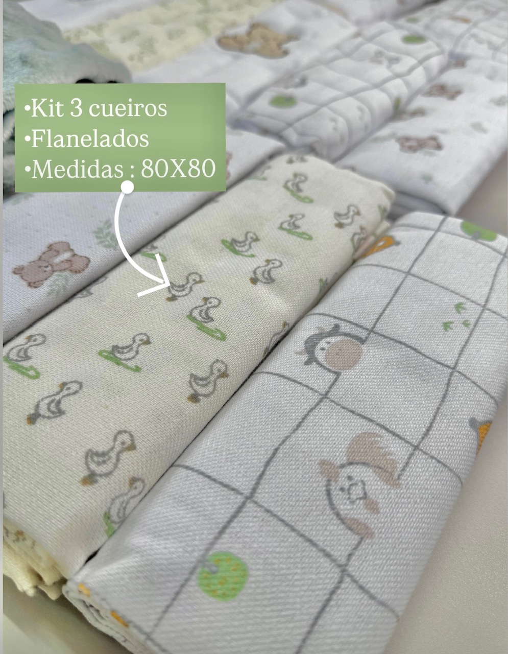 🍼 3 Cueiros Grandes (80cm x 80cm): versáteis e indispensáveis! Use como mantinha leve, para enrolar o bebê tipo charutinho, cobrir o carrinho ou proteger na amamentação. A estampa temática é um charme à parte!
