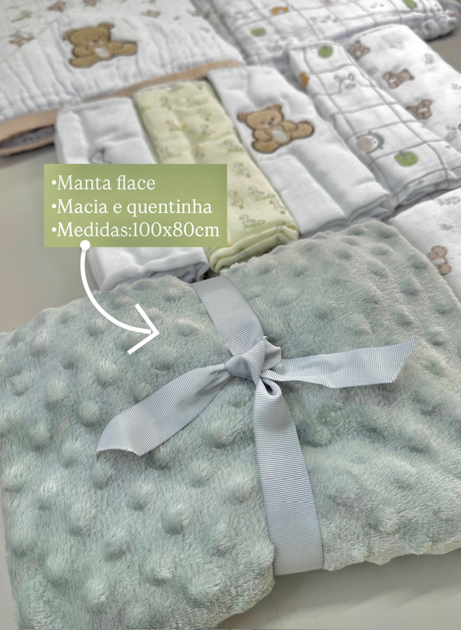 🧸 1 Manta Flace: extremamente macia e quentinha, perfeita para embalar seu bebê no colo, no berço ou no passeio.