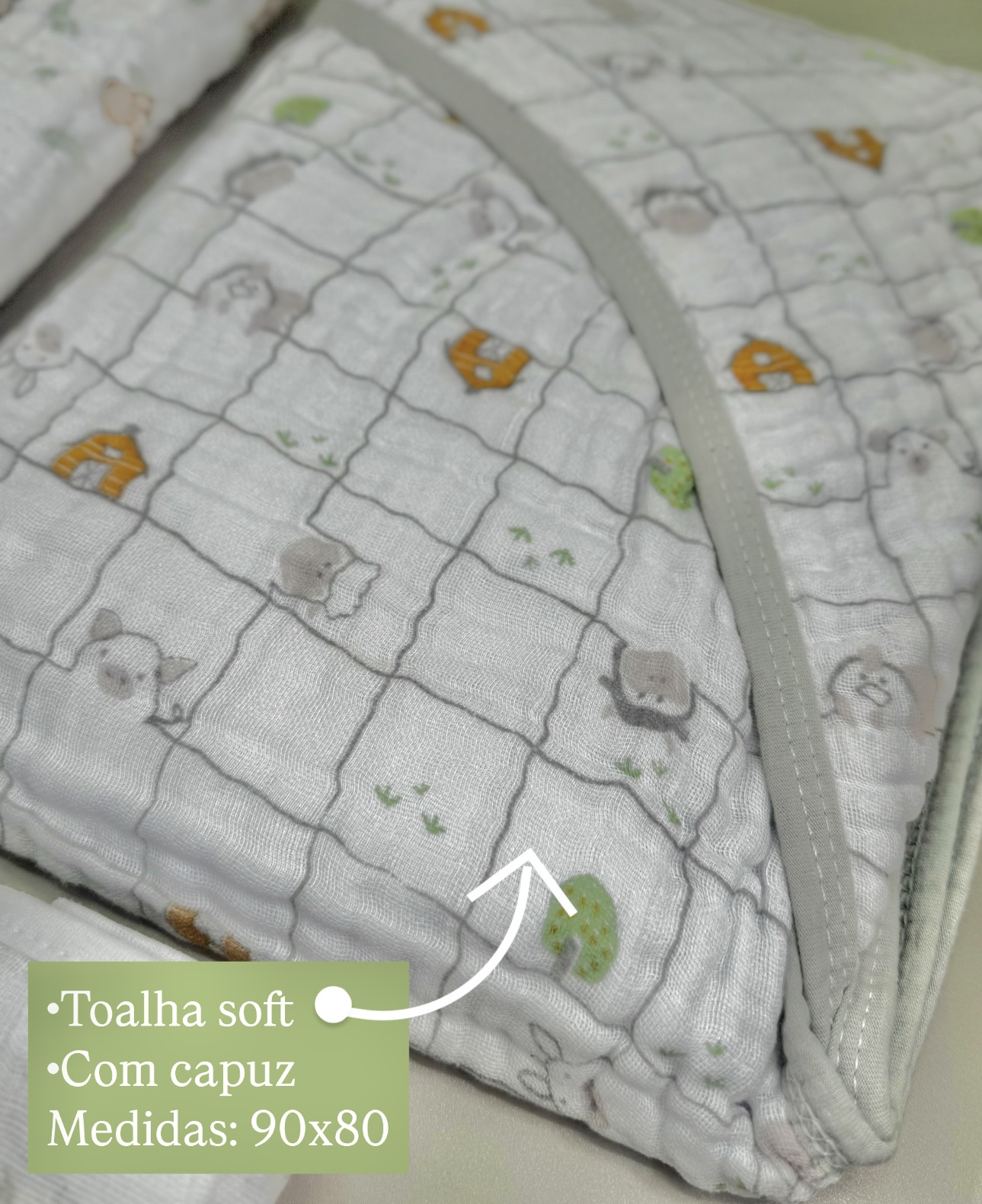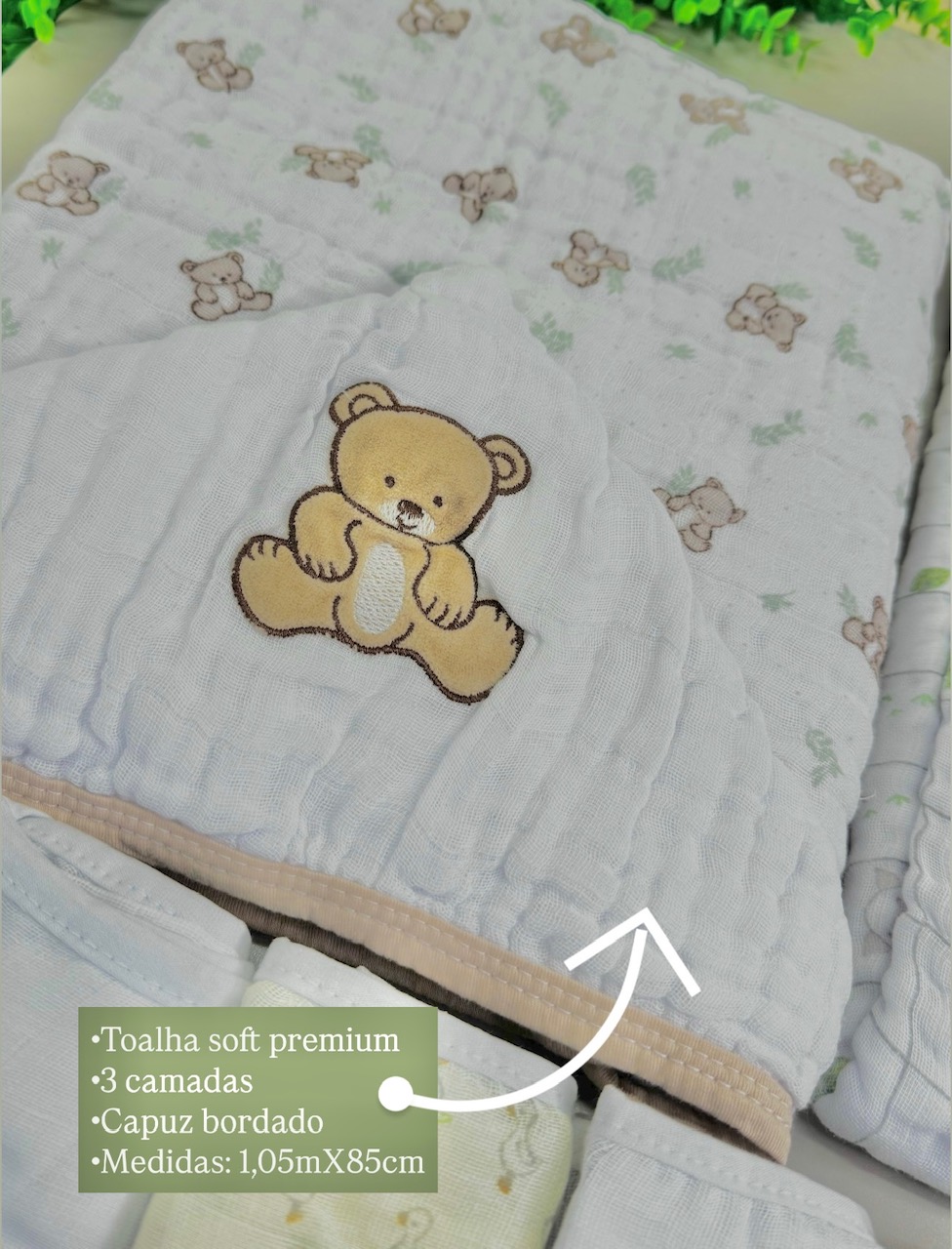 🛁 1 Toalhão Soft com Capuz Bordado (1,05m x 85cm): tamanho ideal para acompanhar o crescimento do bebê até a primeira infância. O bordado fofo e o tecido de alta qualidade garantem praticidade e aconchego.