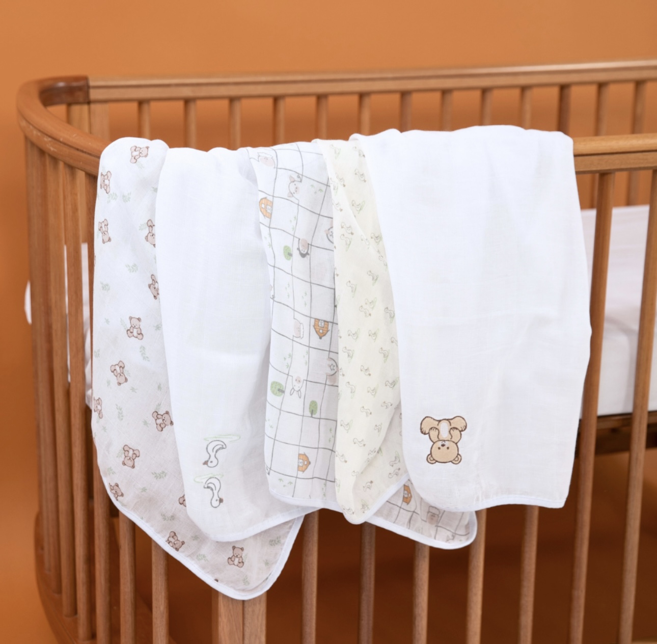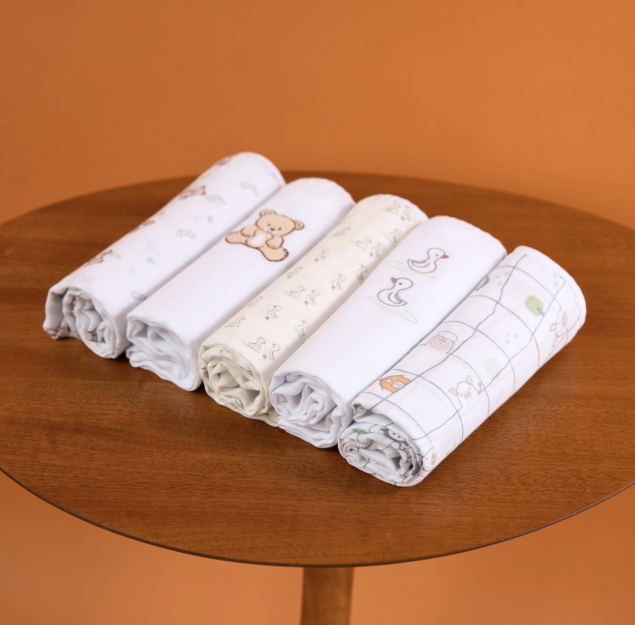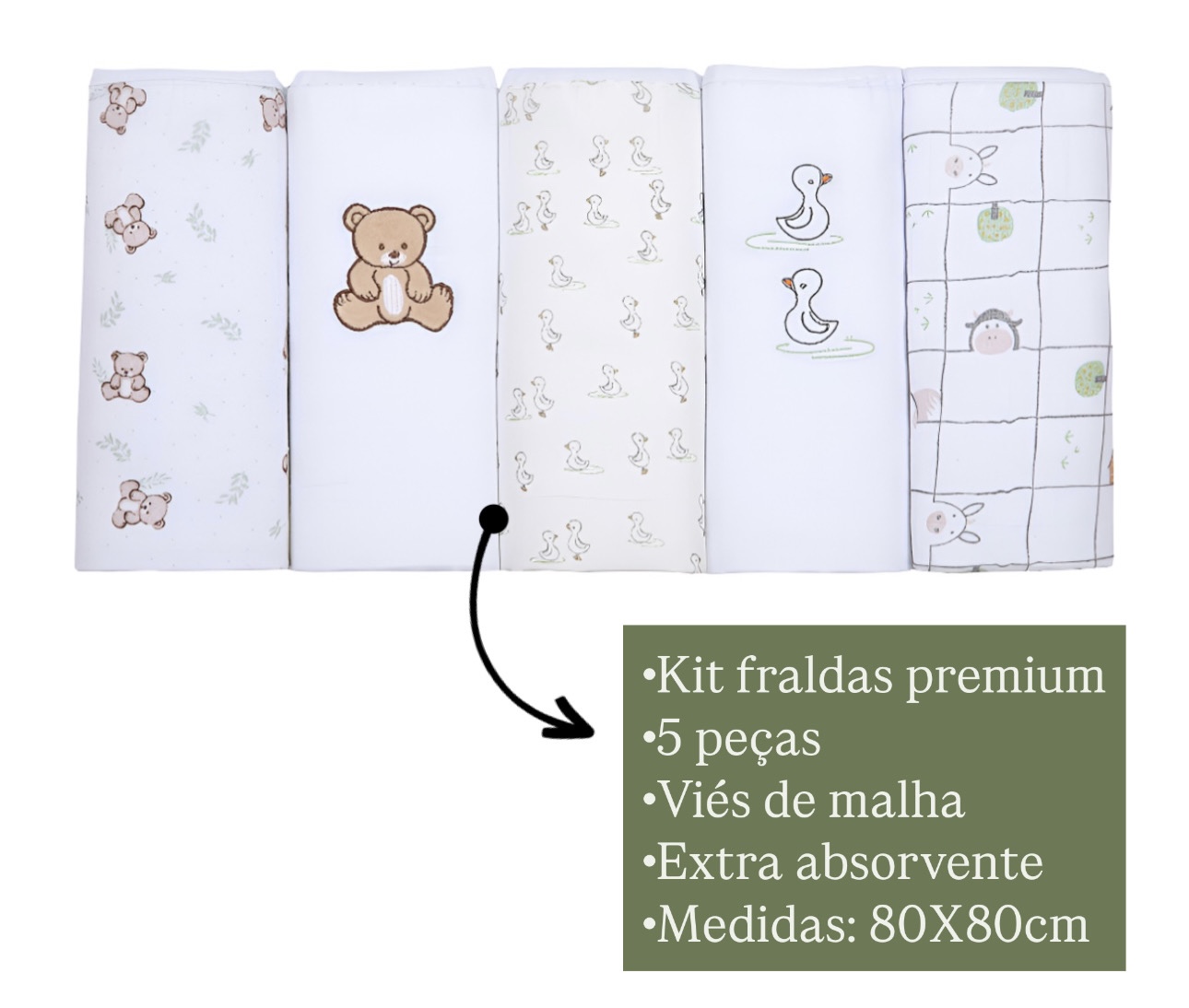 👼 5 Fraldas Premium com Viés: super macias, resistentes e bem acabadas. Ideais para o dia a dia, seja para limpeza, apoio ou proteção da roupinha.