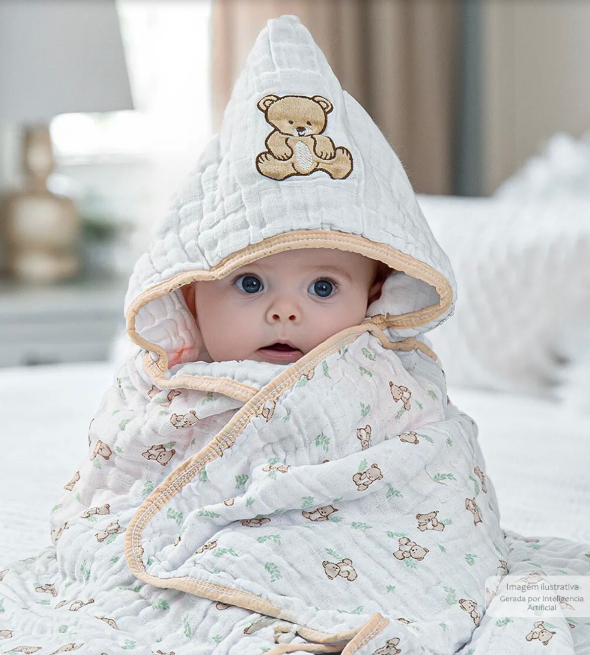 👶 1 Toalha Soft com Capuz: toque suave e absorção eficiente para deixar o bebê sequinho e protegido após o banho.