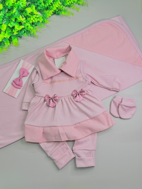 Encante-se com a delicadeza e funcionalidade da Saída Maternidade 5 Peças. Confeccionada em tecido macio e confortável, é perfeita para os primeiros dias do bebê, garantindo bem-estar e muito charme.